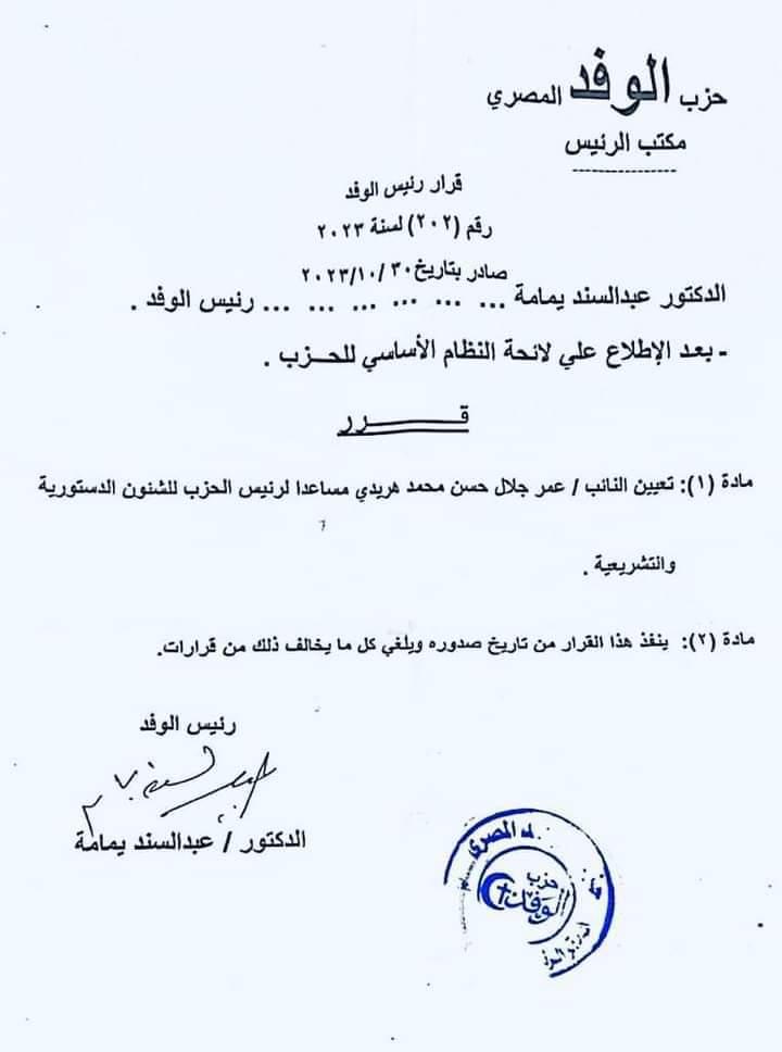 تبرع لحملته الانتخابية.. يمامة يعيّن أحد أعضاء الحزب الوطني المنحل بالوفد وسط غضب من الوفديين | خاص