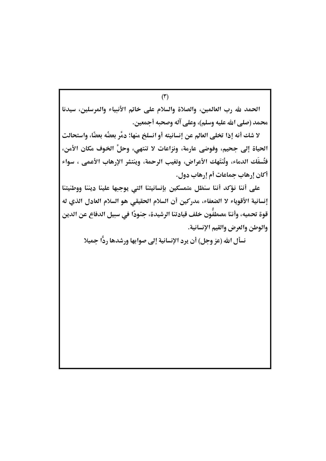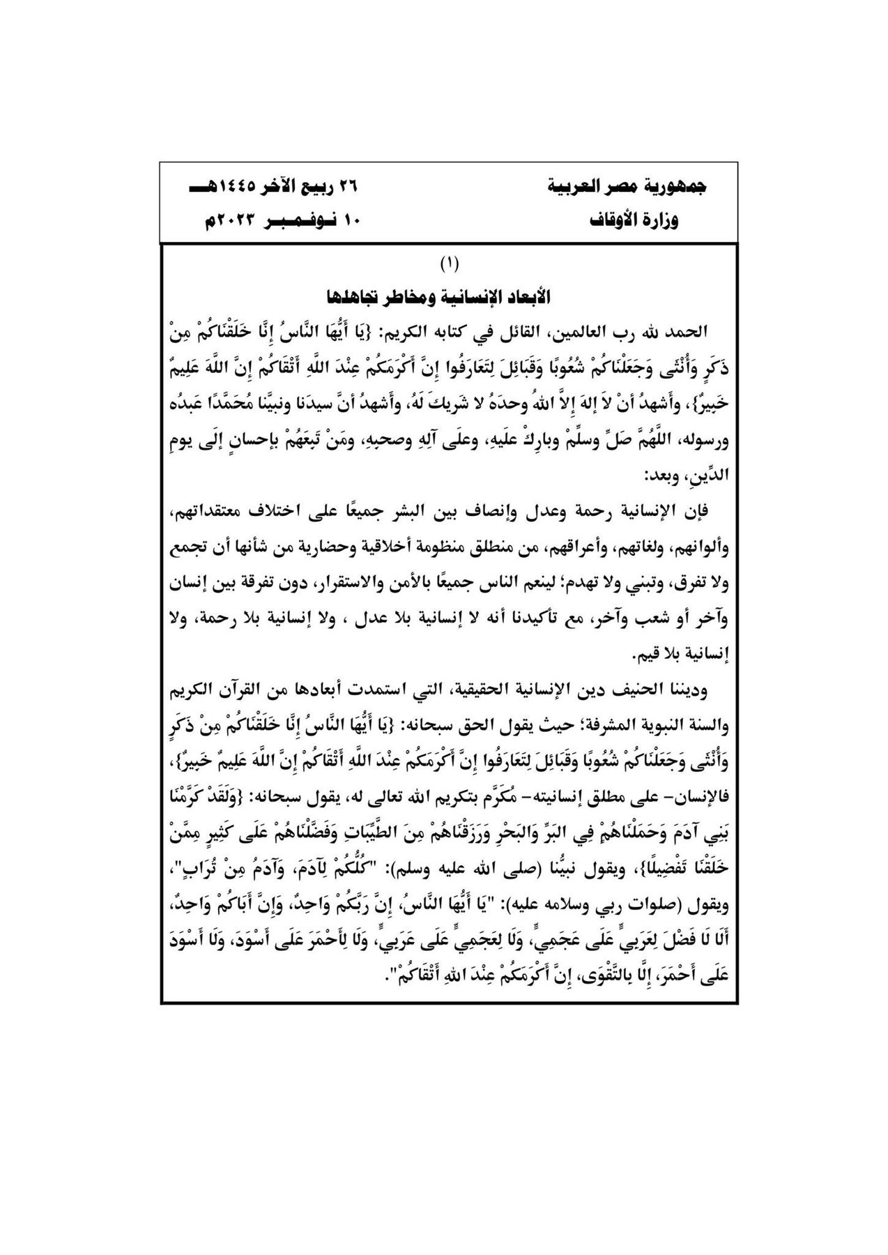 "الحمد لله رب العالمين القائل في كتابه الكريم: {يَا أَيُّهَا النَّاسُ إِنَّا خَلَقْنَاكُمْ مِنْ ذَكَرٍ وَأُنثَى وَجَعَلْنَاكُمْ شُعُوبًا وَقَبَائِلَ لِتَعَارَفُوا إِنَّ أَكْرَمَكُمْ عِنْدَ اللَّهِ أَتْقَاكُمْ إِنَّ اللَّهَ عَلِيمٌ | خَبِيرٌ، وأشهد أن لا إله إلا الله وحدَهُ لا شَريكَ لَهُ، وأشهد أن سيدنا ونبينا مُحَمَّدًا عَبْدُه ورسوله، اللهُمَّ صَلَّ وسلم وبارك عليهِ، وعلى آله وصحبه ومن تبعهم بإحسان إلى يوم الدين، وبعد: