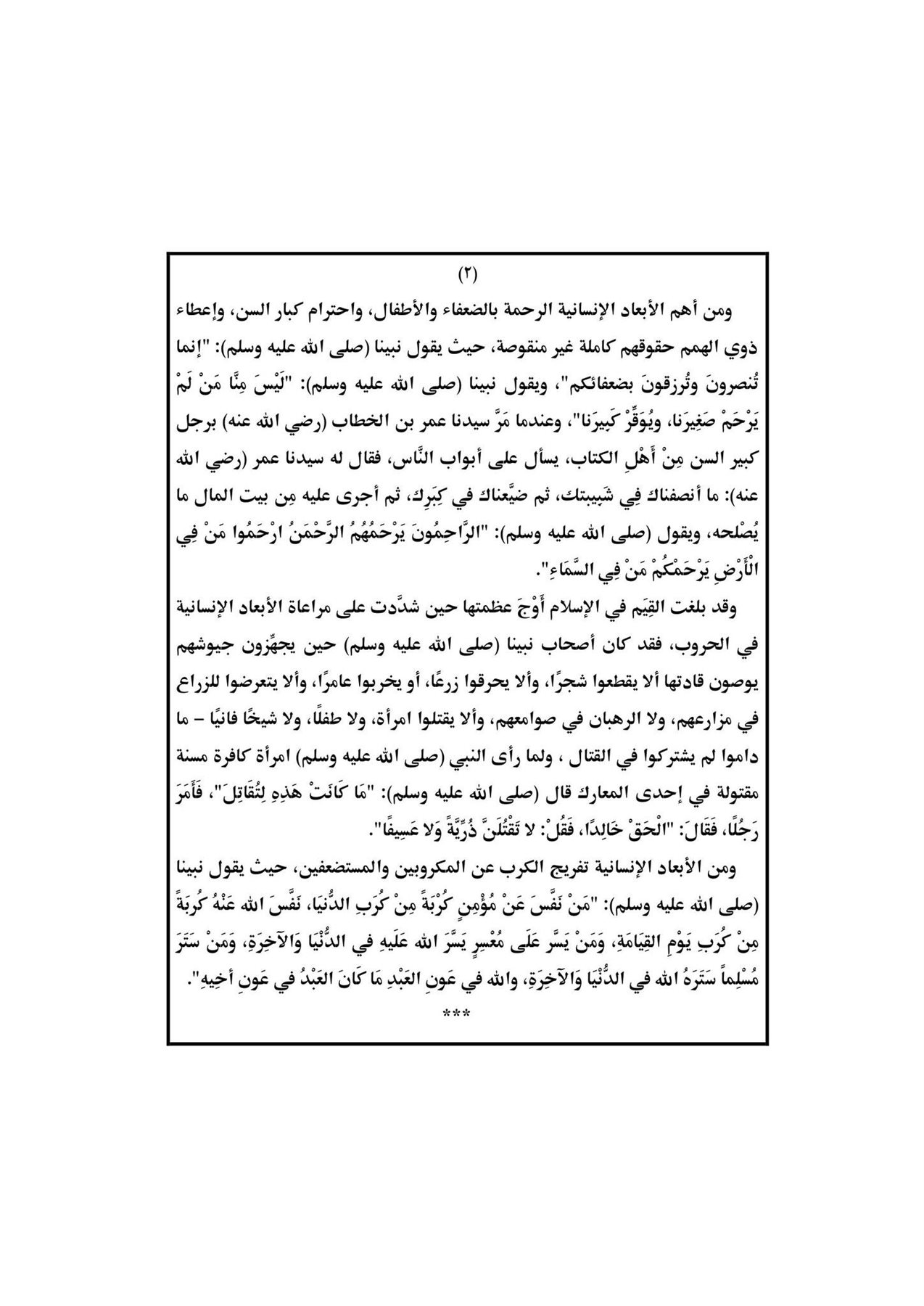 ومن أهم الأبعاد الإنسانية الرحمة بالضعفاء والأطفال، واحترام كبار السن، وإعطاء ذوي الهمم حقوقهم كاملة غير منقوصة، حيث يقول نبينا صلى الله عليه وسلم: "إنما تنصرونَ وتُرزقون بضعفائكم"، ويقول نبينا صلى الله عليه وسلم): لَيْسَ مِنَّا مَنْ لَمْ يَرْحَمْ صَغِيرَنا، ويُوَفِّرْ كَبيرنا"، وعندما مَرَّ سيدنا عمر بن الخطاب (رضي الله عنه) برجل كبير السن مِنْ أَهْلِ الكتاب يسأل على أبواب النَّاس، فقال له سيدنا عمر (رضي الله عنه): ما أنصفناك في شبيبتك، ثم ضيعناك في كبرك، ثم أجرى عليه من بيت المال ما يصلحه، ويقول صلى الله عليه وسلم): "الرَّاحِمُونَ يَرْحَمُهُمُ الرَّحْمَنُ ارْحَمُوا مَنْ فِي الْأَرْضِ يَرْحَمُكُمْ مَنْ فِي السَّمَاء".