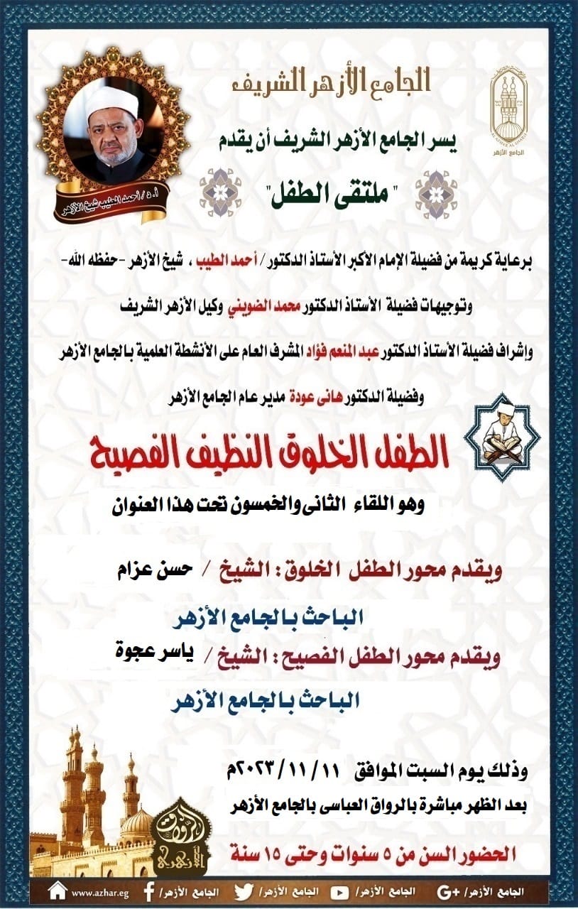 يأتي ملتقى الطفل الذي يعقد السبت من كل أسبوع بالجامع الأزهر، في إطار مواصلة الجامع الأزهر والرواق الأزهري، جهودهما في توعية النشء بالآداب الإسلامية والأخلاقيات السليمة النابعة من صحيح الدين.