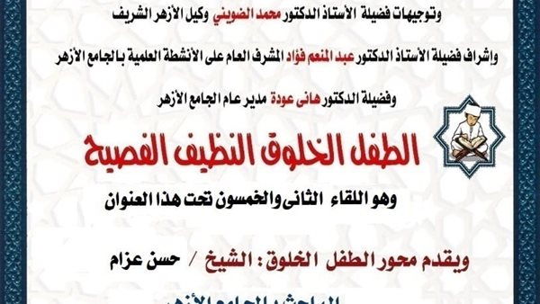 وأكدَّ الدكتور هاني عودة، مدير عام الجامع الأزهر، أن ملتقى الطفل الخلوق والنظيف والفصيح"، يعقد يوم السبت من كل أسبوع بالجامع الأزهر، مشيراً إلى أن الهدف منه تعليم وتربية وتوعية الأجيال القادمة بالأخلاق والآداب الإسلامية، وشرحها بطريقة سهلة وميسرة بمنهج الأزهر الوسطي المعتدل، لافتاً إلى أنه من المقرر أن يتم تنفيذه في بعض المحافظات ، وذلك ليعم النفع بجميع أنحاء الوطن.