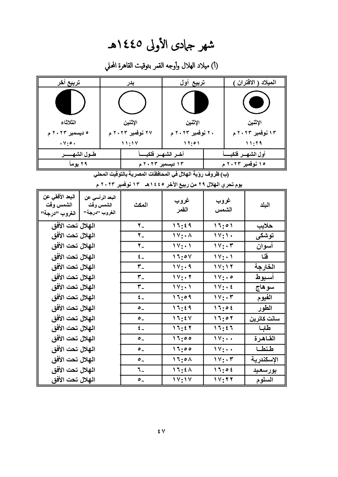أعلن المعهد القومي للبحوث الفلكية والجيوفيزيقية، بأنه طبقا للحسابات الفلكية التي يقوم بها معمل أبحاث الشمس بالمعهد برئاسة الدكتور ياسر عبد الهادي بأن هلال شهر جمادى الأولى سوف يولد مباشرة بعد حدوث الاقتران في تمام الساعة 11:29 صباحا بتوقيت القاهرة المحلي، يوم الاثنين 29 من ربيع الآخـر 1445هـ الموافق 13/11/2023م (يوم الرؤية).
