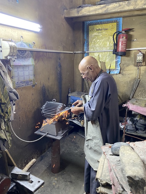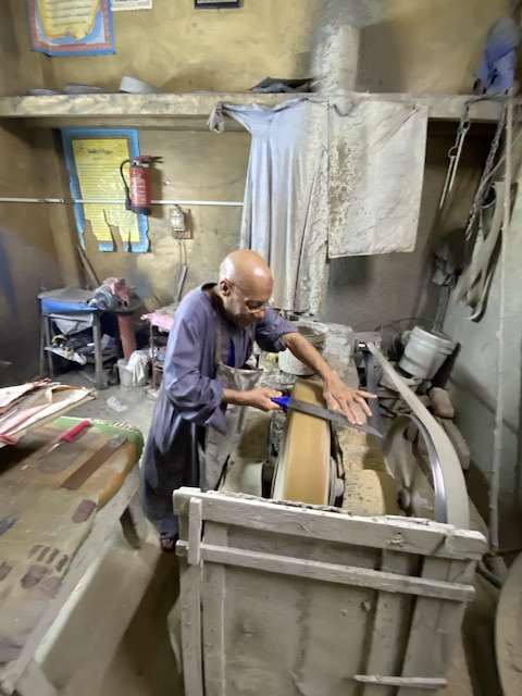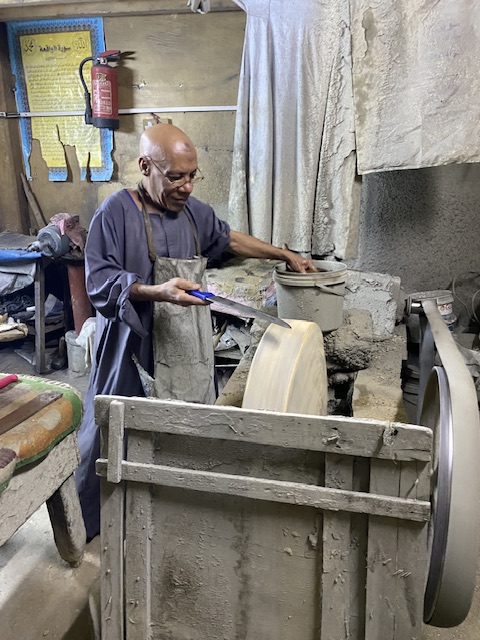 يقف على حجر دوار وزنة يفوق الـ 150 كيلو ممسكا بالسكاكين لتنعيمها بعد حدها على حجر كهربائي في مهنة توارثها أبا عن جد بالأقصر في شحذ وسن السكاكين في مهنة وحرفة يدوية قاربت على الاندثار في ظل الحداثة وعصر التكنولوجيا.