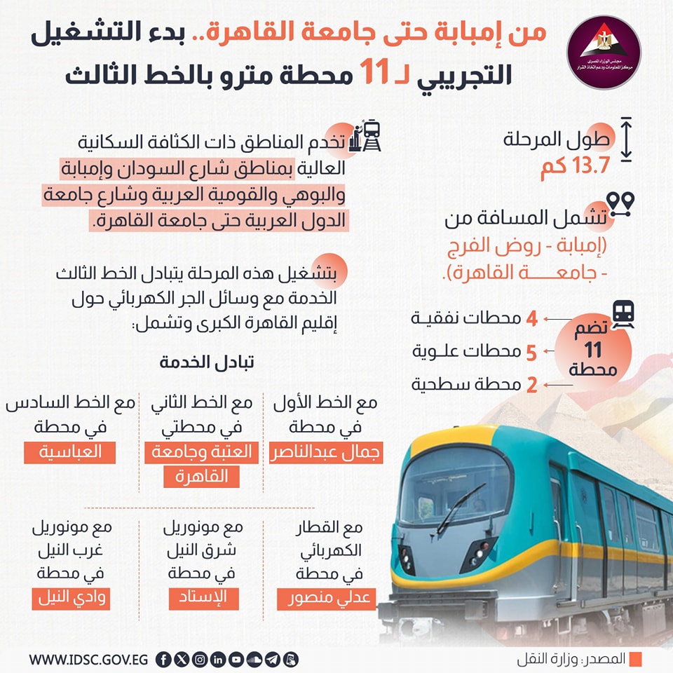 سلط مركز المعلومات ودعم اتخاذ القرار تابع لـ مجلس الوزراء الضوء على بدء التشغيل التجريبي لـ 11 محطة مترو بالخط الثالث، والذي يشمل من محطة إمبابة حتى جامعة القاهرة.