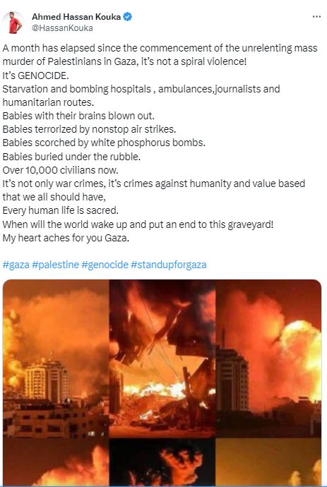 وكتب كوكا عبر حسابه الرسمي على موقع التدوينات إكس: مر شهر منذ بدء القتل الجماعي المتواصل للفلسطينيين في غزة.. إنها إبادة جماعية وليست دائرة قتال.. تجويع، وقصف المستشفيات وسيارات الإسعاف والصحفيين والطرق الإنسانية.