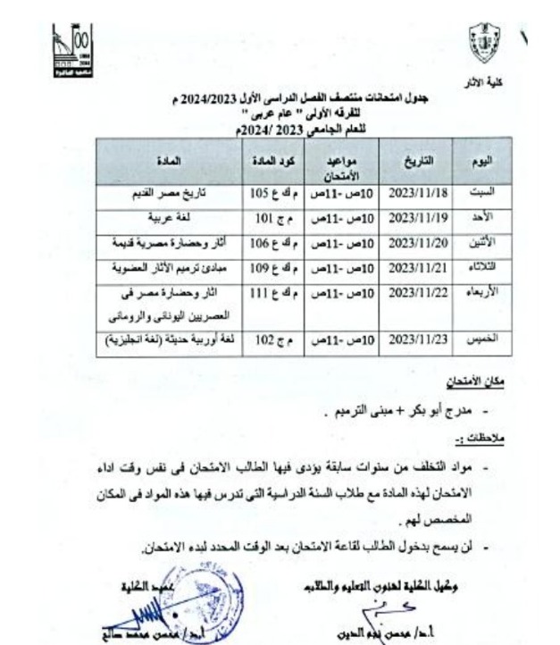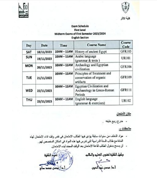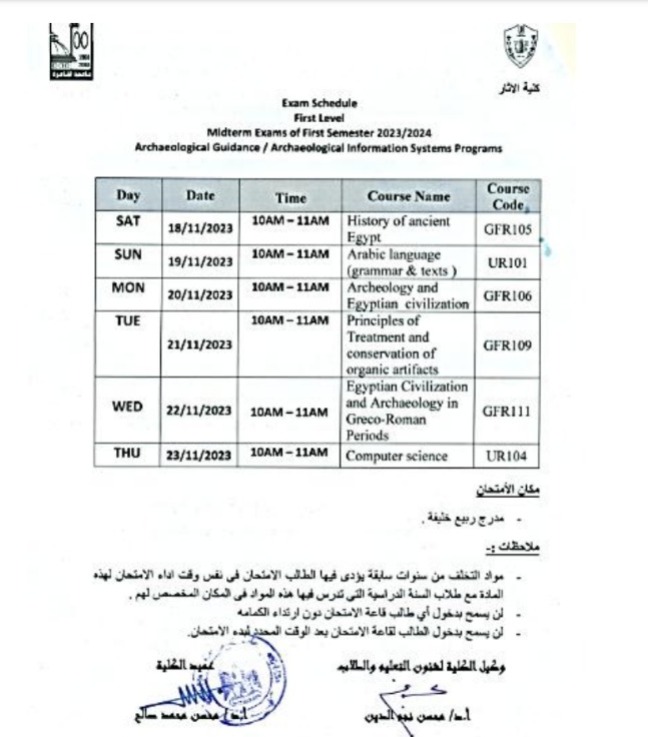 آثار القاهرة تعلن جدول امتحانات الميدتيرم 2023 لطلاب الفرقة الأولى | صور