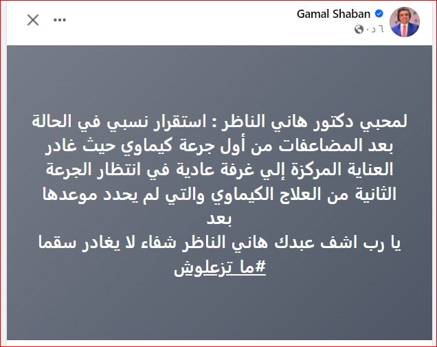 وكتب الدكتور جمال شعبان عبر صفحته الشخصية بموقع التواصل الاجتماعي فيسبوك: لمحبي الدكتور هاني الناظر.. استقرار نسبي في الحالة بعد المضاعفات من أول جرعة كيماوي.. حيث غادر العناية المركزة إلى غرفة عادية.