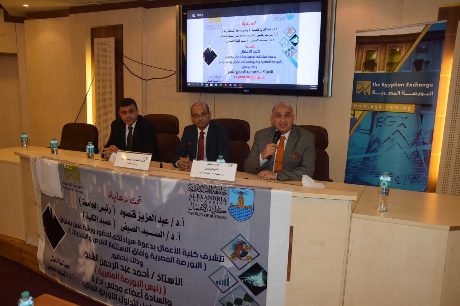 شارك أحمد الشيخ رئيس البورصة المصرية، كمتحدث رئيسي في ورشة عمل نظمتها كلية الأعمال بجامعة الإسكندرية بعنوان أسواق المال وآليات الاستثمار في بورصة الأوراق المالية المصرية، في إطار حرص البورصة المصرية على نشر الوعي المالي والثقافة المالية بين الطلاب.