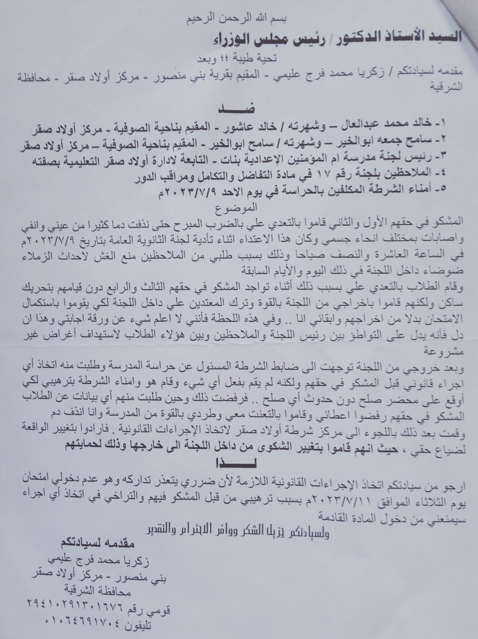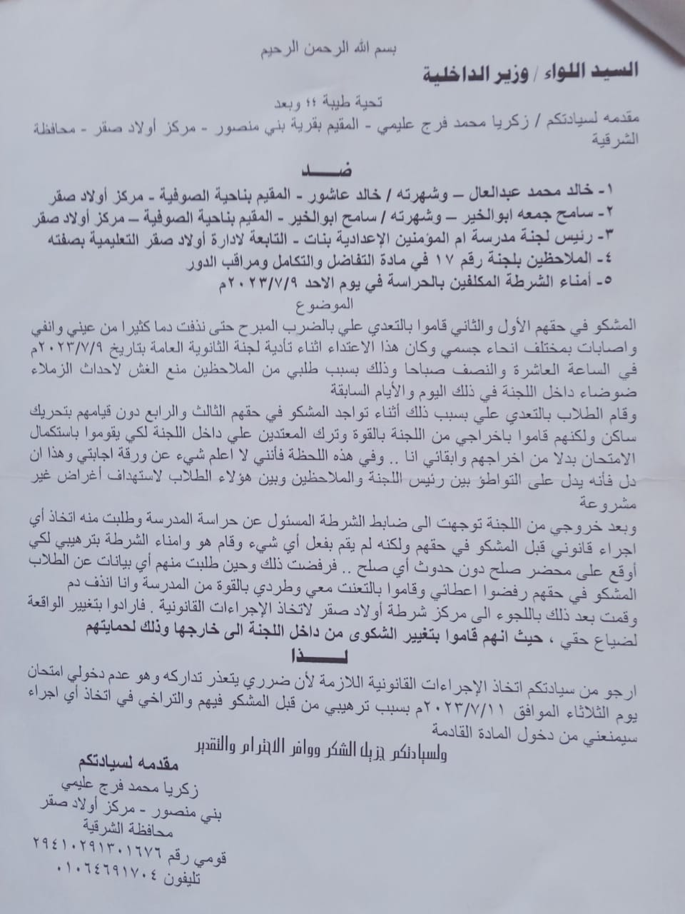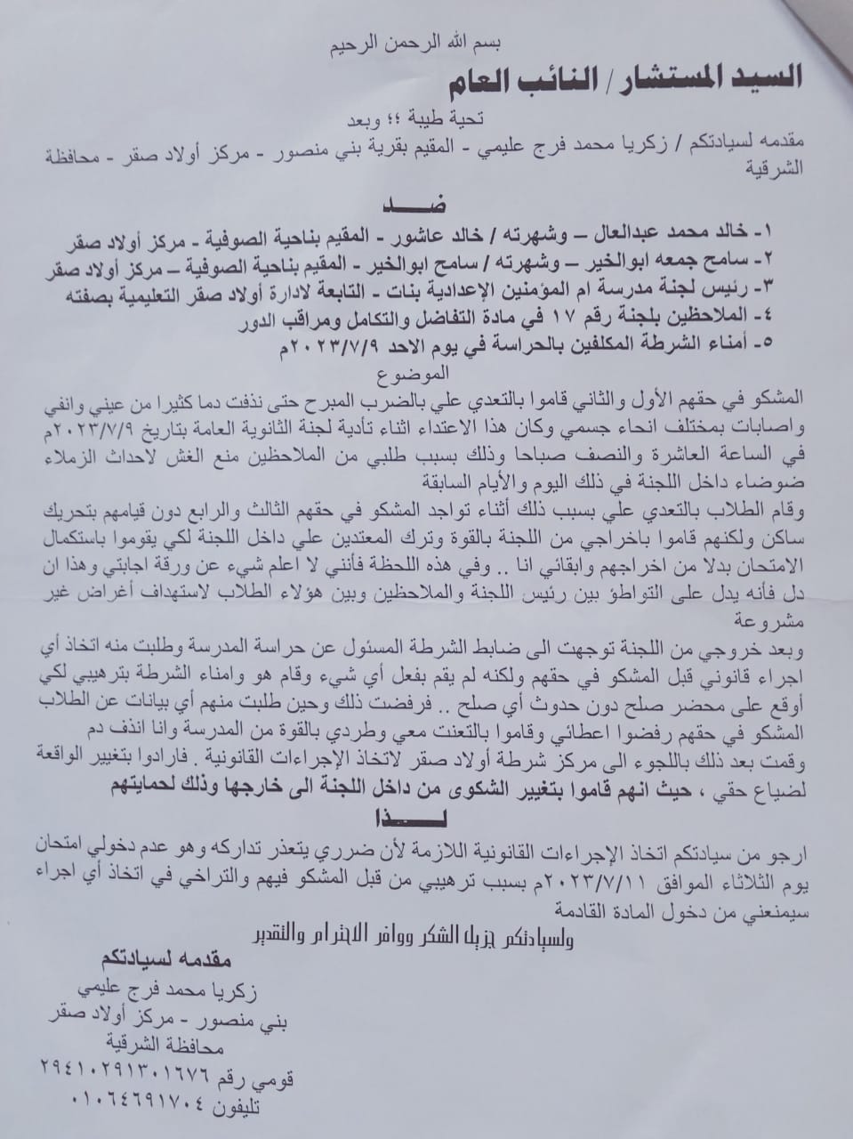 وتابع زكريا، أن الطالبين اتحكم عليهما بـ حبس أسبوع مع الشغل والنفاذ يوم 24 - 10 - 2023 وغرامة 1000 جنيه لكل واحد منهم بسبب اعتدائهم عليا داخل اللجنة بسبب طلبي من الملاحظين بمنع الغش، مطالبًا جميع المسؤولين بـ ظهور نتيجته، لكونه تعب كثيرًا حتى يستطيع استكمال دراسته في الثانوية العامة، والالتحاق بالجامعة المناسبة لمجموعه.