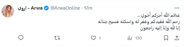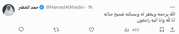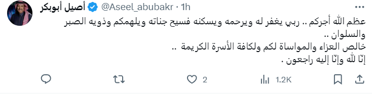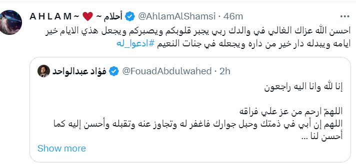 وكتبت المطربة الإماراتية أحلام: أحسن الله عزاك الغالي في والدك ربي يجبر قلوبكم ويصبركم ويجعل هذي الأيام خير أيامه ويبدله دار خير من داره ويجعله في جنات النعيم.