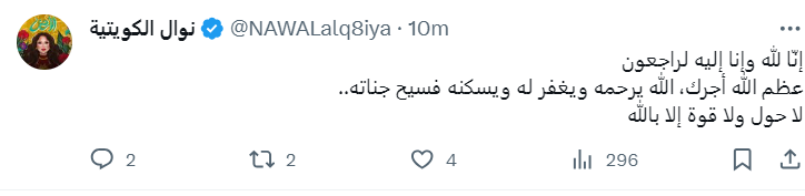 وحرصت الفنانة نوال الكويتية، على تعزية المطرب اليمني فؤاد عبد الواحد في وفاة والده، إنّا لله وإنا إليه لراجعون، عظم الله أجرك، الله يرحمه ويغفر له ويسكنه فسيح جناته، لا حول ولا قوة إلا بالله.