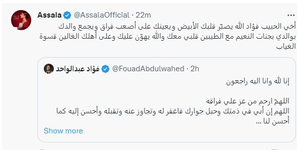 كما نعت الفنانة السورية أصالة نصري، المطرب اليمني فؤاد عبد الواحد، معلقة: أخي الحبيب فؤاد الله يصبّر قلبك الأبيض ويعينك على أصعب فراق ويجمع والدك بوالدي بجنات النعيم مع الطيبين قلبي معك والله يهوّن عليك وعلى أهلك الغالين قسوة الغياب