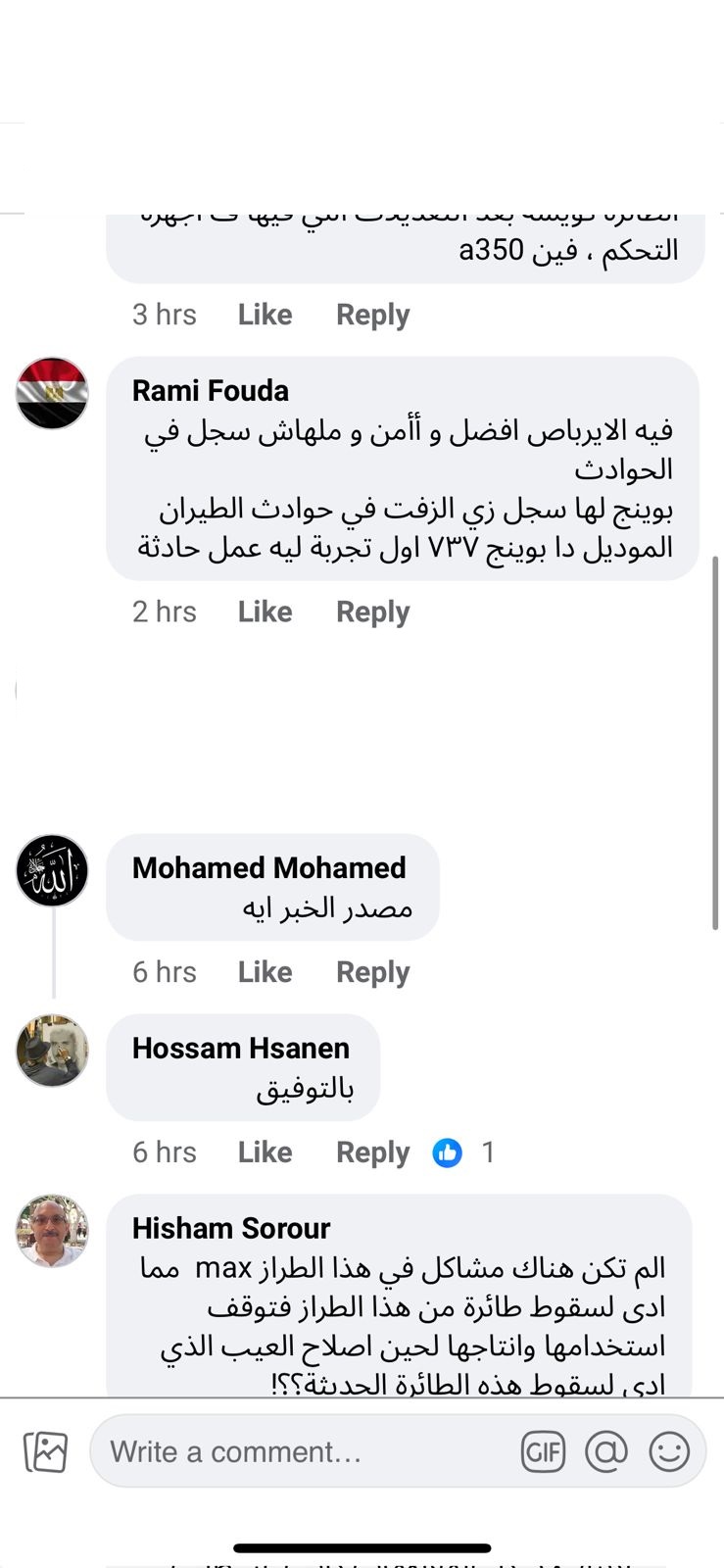 وأوضح الطيار رامي فودة، في الجروب الرسمي الخاص بالطيارين بموقع فيس بوك، أن طائرات بوينج تحمل سجلا سيئا من حوادث الطيران، مشيرا إلى أن له تجربة مع هذا الطراز بوينج ماكس 737 تسببت له في وقوع حادث، مرشحا التعاقد على طائرات إيرباص لأمانها وعدم وجود سجل حوادث لها.