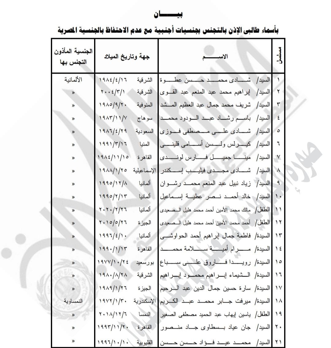 ونص القرار على أن يؤذن لكل من الواحد والعشرين مواطنا (أولهم شادي محمد حسن عطوه - وآخرهم محمد عيد فؤاد حسن حسن المدرجة أسماؤهم بالبيان المرفق بالتجنس بالجنسية الأجنبية الموضحة قرين اسم كل منه، مع عدم احتفاظهم بالجنسية المصرية.