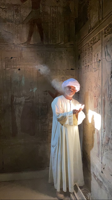 وقال كبير عمال معابد الكرنك: في المنصة حيث آمون يمثل أوزوريس والذي يتم بعثه إلى ولادة جديدة وتحديدا لشباب أوزوريس، حيث يظهر بشكل حورس ولذلك يعد معبد أوبت مسقط رأس أوزوريس، ومكان دفن آمون، كما توجد الآلهة حتحور تزين تيجان المعبد بوجه ذي ألوان زاهية.