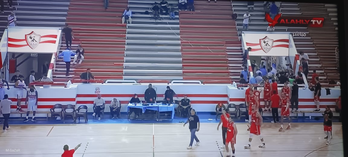 في المقابل، أجرى لاعبي فريق السلة بنادي الأهلي والزمالك إحماء في ملعب المباراة خلال التوقف على أمل عودة لقاء واستئنافه