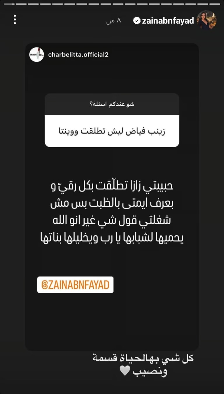 وردت زينب فياض على سؤال إحدى متابعيها حول طلاقها، وقالت عبر خاصية ستورى على حسابها الشخصي بإنستجرام: كل شيء في الحياة قسمة ونصيب.
