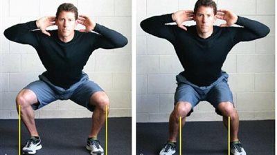 - الآن ستقوم بالجلوس مثل القرفصاء بحيث يتكون الركبة متوازية مع قدميك