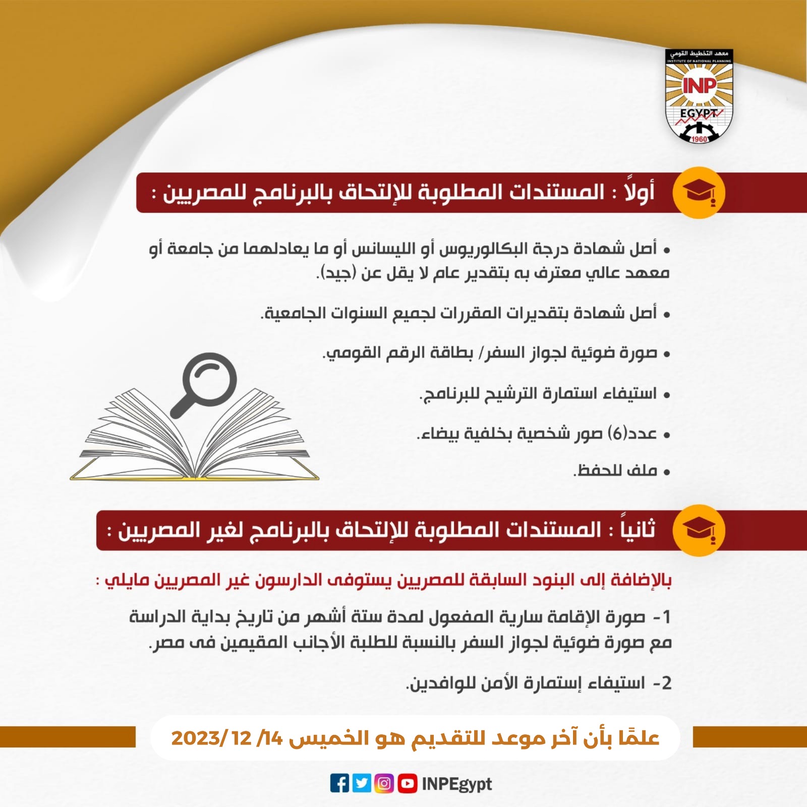 معهد التخطيط القومي يعلن فتح باب التقدم لدراسة ماجستير المتابعة والتقييم للعام الأكاديمي 2023/2024