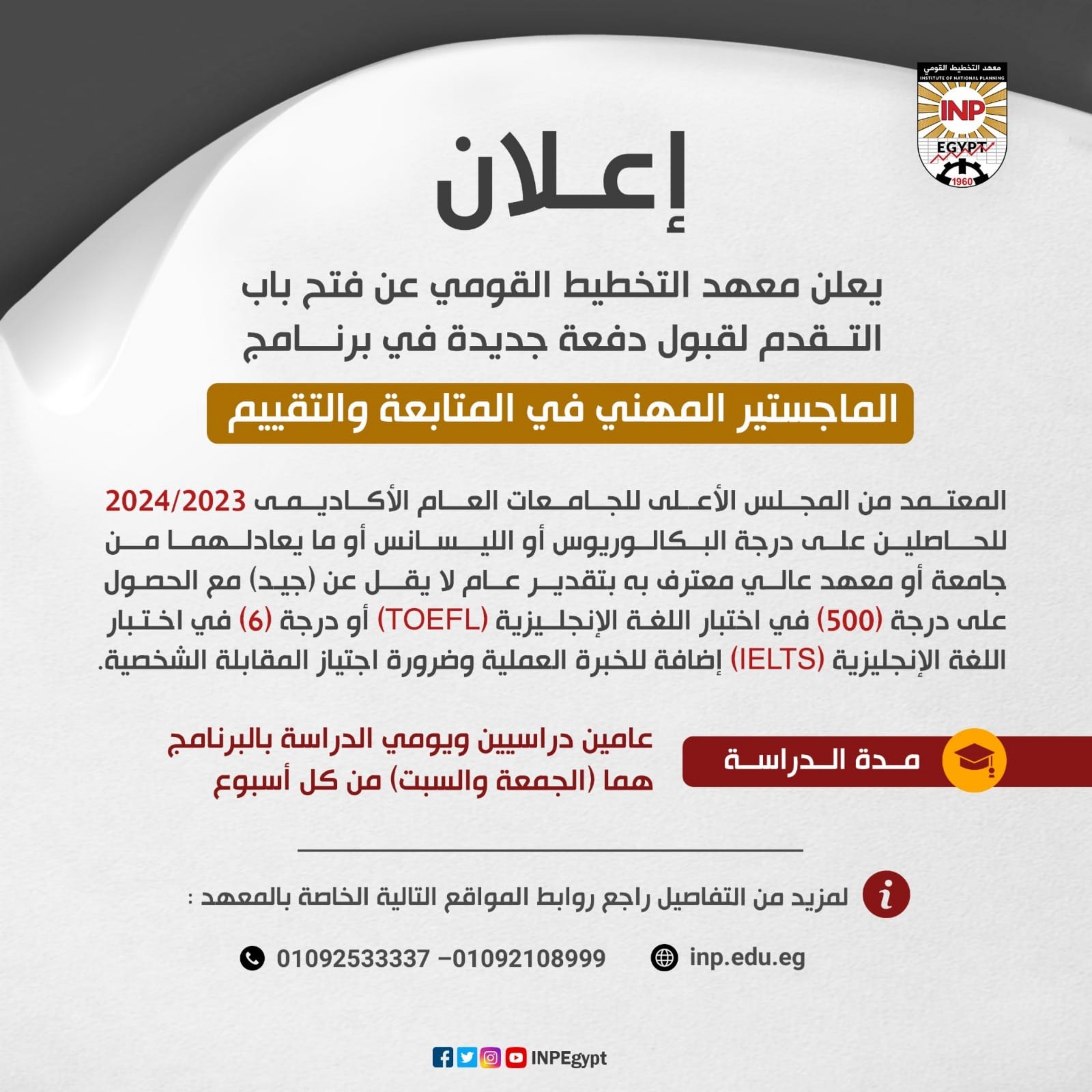 أعلن معهد التخطيط القومي فتح باب التقدم لقبول دفعة جديدة في برنامج الماجستير المهني في المتابعة والتقييم المعتمد من المجلس الأعلى للجامعات للعام الأكاديمي 2023/2024، للحاصلين على درجة البكالوريوس أو الليسانس أو ما يعادلهما من جامعة أو معهد عالي معتمد.