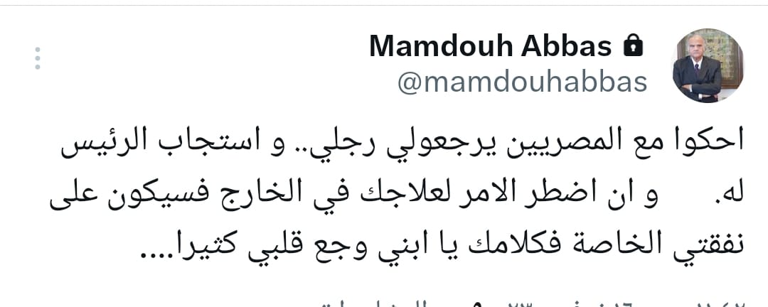 وقال ممدوح عباس عبر حسابه الشخصي على موقع التواصل الاجتماعي تويتر: احكوا مع المصريين يرجعولي رجلي.. واستجاب الرئيس له، و إن اضطر الامر لعلاجك في الخارج فسيكون على نفقتي الخاصة فكلامك يا ابني وجع قلبي كثيرًا.