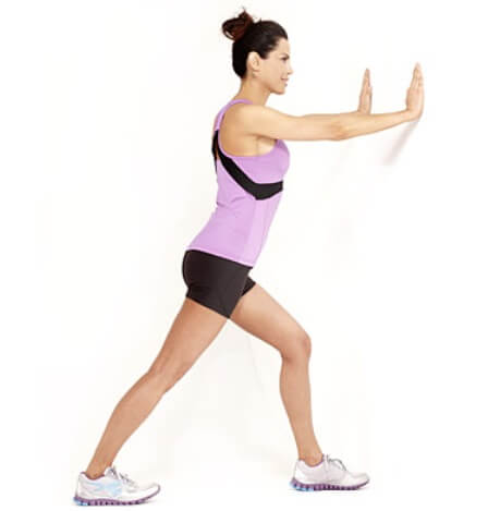 - قف أمام الحائط مع وضع ساق أمام الساق الثانية