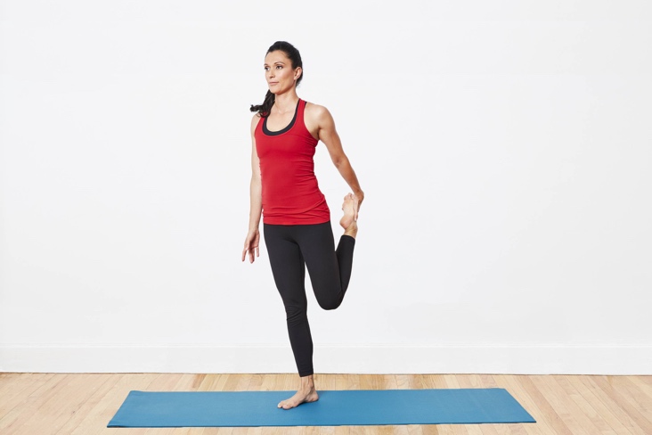 - الآن ارفع الكاحل الأيسر بواسطة يديك اليسرى إلى أعلى في اتجاه المؤخرة مع رفع اليد اليمنى إلى أعلى.