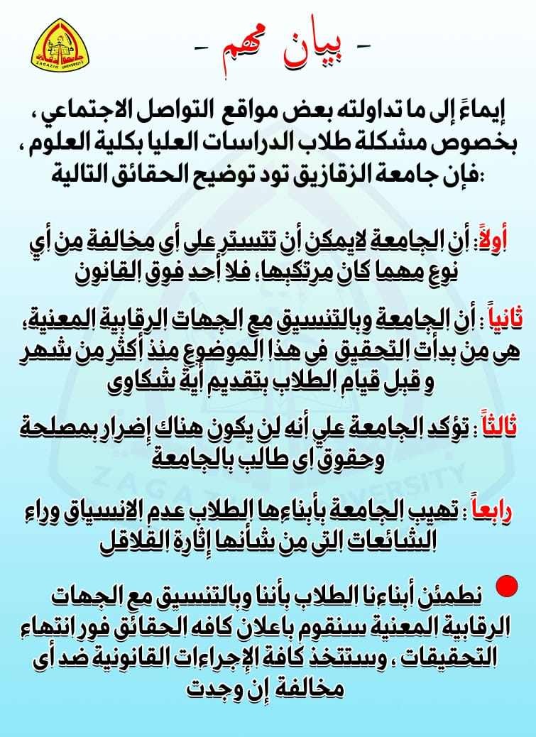 أصدرت جامعة الزقازيق بيانا رسميًا، بخصوص واقعة النصب على طلاب دبلومة الكيمياء الحيوية في كلية العلوم وتجميع مبالغ مبالية منهم تخطت 14 مليون جنيه دون توريدها للخزينة الجامعة، وذلك بعد انفراد القاهرة 24 بنشر كل تفاصيل الواقعة منذ بدايتها بالأدلة والمستندات.