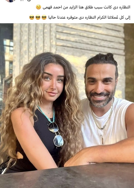 ونشر سيد الطواب صاحب المحل على صفحتة بموقع التواصل الاجتماعي فيس بوك مرفقا بصورة الفنانة هنا الزاهد وهي تضع إحدى النظارات وبجوارها الفنان أحمد فهمي قائلا: النظارة دي كانت سبب طلاق هنا الزايد من أحمد فهمي.