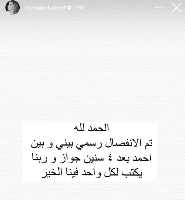 وكانت الفنانة هنا الزاهد قد نشرت في القصة عبر موقعها على موقع التواصل الاجتماعي إنستجرام خبر انفصالها عن زوجها الفنان أحمد فهمي قائلة: الحمد لله تم الانفصال رسمي بيني وبين احمد بعد 4 سنين جوار وربنا يكتب لكل واحد فينا الخير.