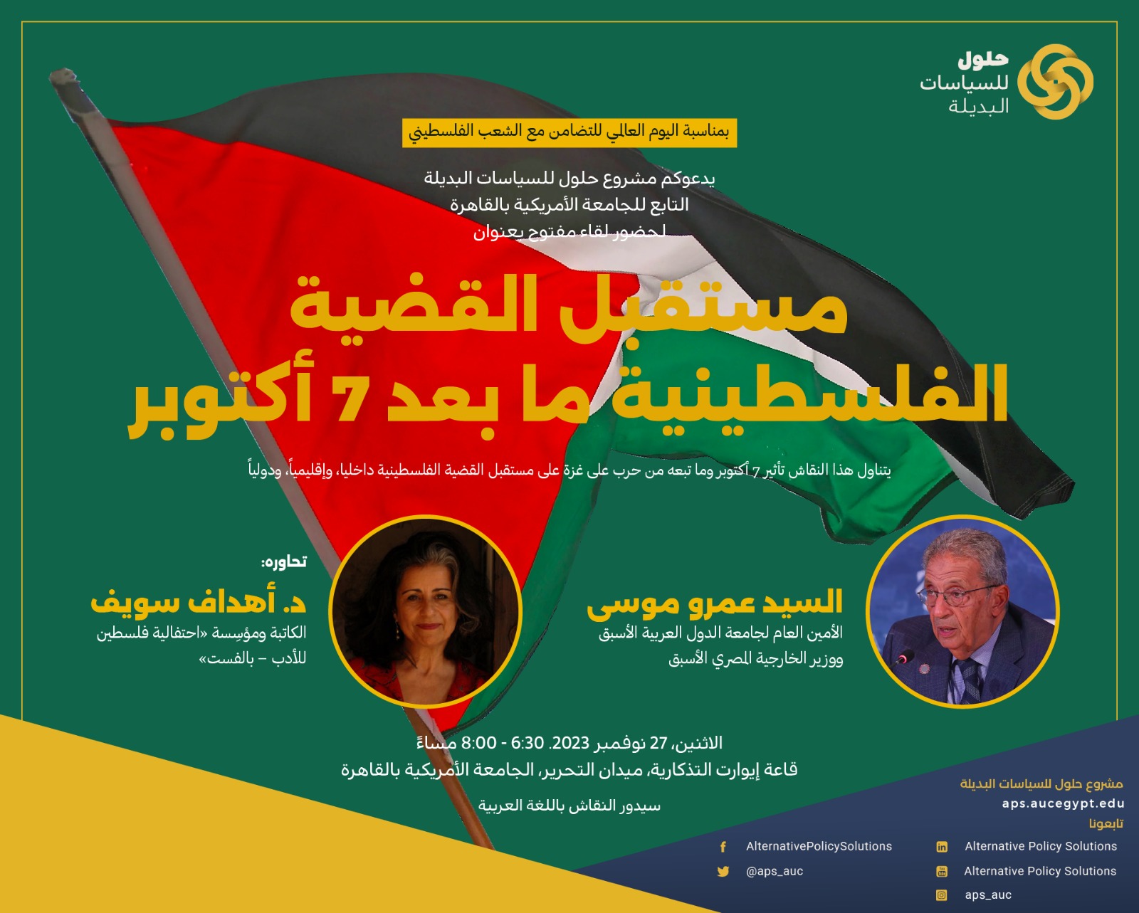 يستضيف مشروع حلول للسياسات البديلة التابع لـ الجامعة الأمريكية بالقاهرة عمرو موسى، الأمين العام لجامعة الدول العربية الأسبق، ووزير الخارجية المصري الأسبق يوم الاثنين 27 نوفمبر 2023 وذلك خلال لقاء مفتوح بعنوان "مستقبل القضية الفلسطينية… ما بعد 7 أكتوبر".