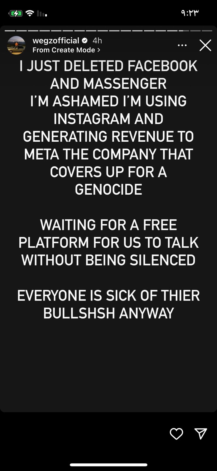ونشر ويجز عبر حسابه الشخصي على موقع تبادل الصور والفيديوهات انستجرام، استوري، يعلن فيه حذف حسابه على الفيس بوك وماسنجر تضامنا مع فلسطين، إذ كتب رسالة باللغة الإنجليزية: حذفت الفيسبوك وماسنجر الآن، وحاسس بالخجل إني بستخدم انستجرام، بسبب الإيرادات اللي بتروح لشركة ميتا وبتستثمر الفلوس دي في الإبادة الجماعية، وأنا في انتظار منصة مجانية لنا للتحديث دون أن نسكت، كلنا زهقنا من كلامهم على أي حال.