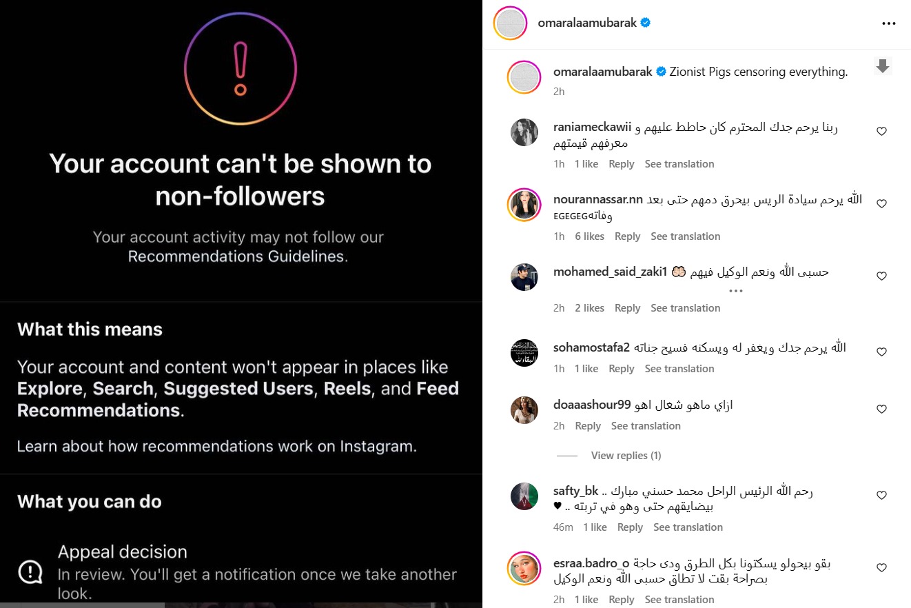 وأثار تقييد حساب انستجرام الخاص الخاص بـ عمر علاء مبارك، حفيد الرئيس الأسبق محمد حسني مبارك، بعد مهاجمته إسرائيل، ردود أفعال لرواد مواقع التواصل الاجتماعي، وبدأوا في مهاجمة إدارة موقع التواصل الاجتماعي انستجرام بعد غلقها الحساب.