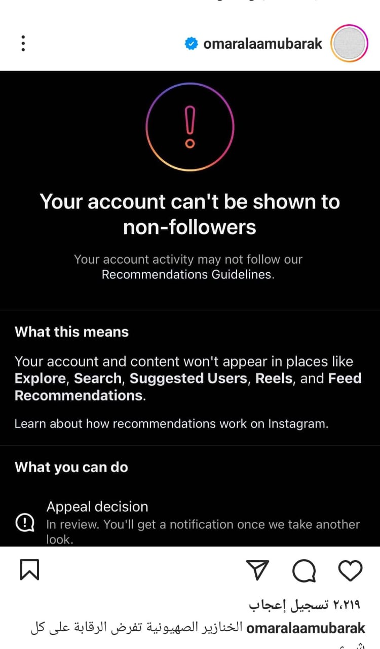 ونشر عمر علاء مبارك، حفيد الرئيس الأسبق محمد حسني مبارك، بعد مهاجمته لإسرائيل، صورة تبين تقييد حسابه الخاص انستجرام، وعلق: الخنازير الصهيونية تفرض الرقابة على كل شيء.