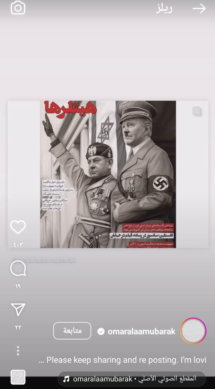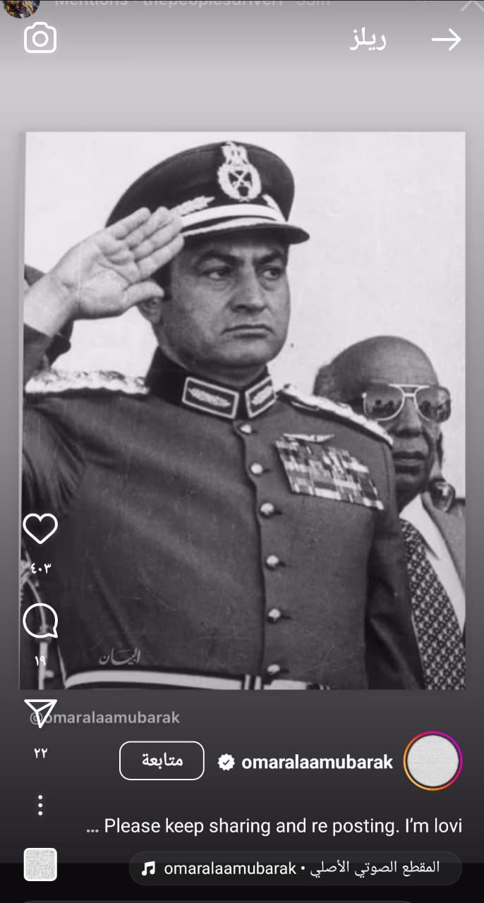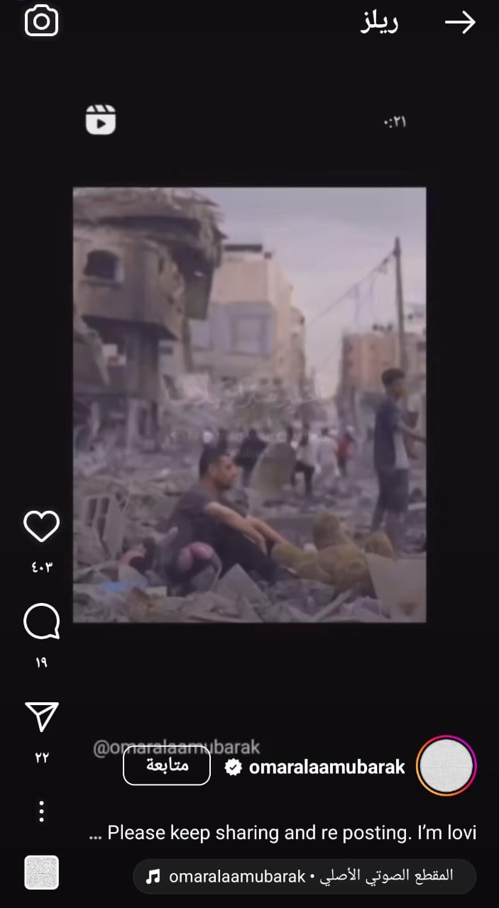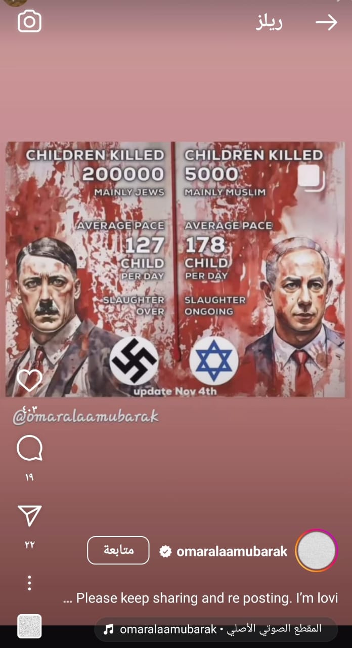 ولم يكف عمر علاء مبارك، حفيد الرئيس الأسبق محمد حسني مبارك، عن مهاجمة إسرائيل بعد معاقبته من إدارة موقع التواصل الاجتماعي انستجرام، ونشر منذ قليل منشورات وفيديوهات قصيرة وعلق: يرجى الاستمرار في المشاركة وإعادة النشر، أحب أغضب الصهيوني في رسائلي والتعليقات.