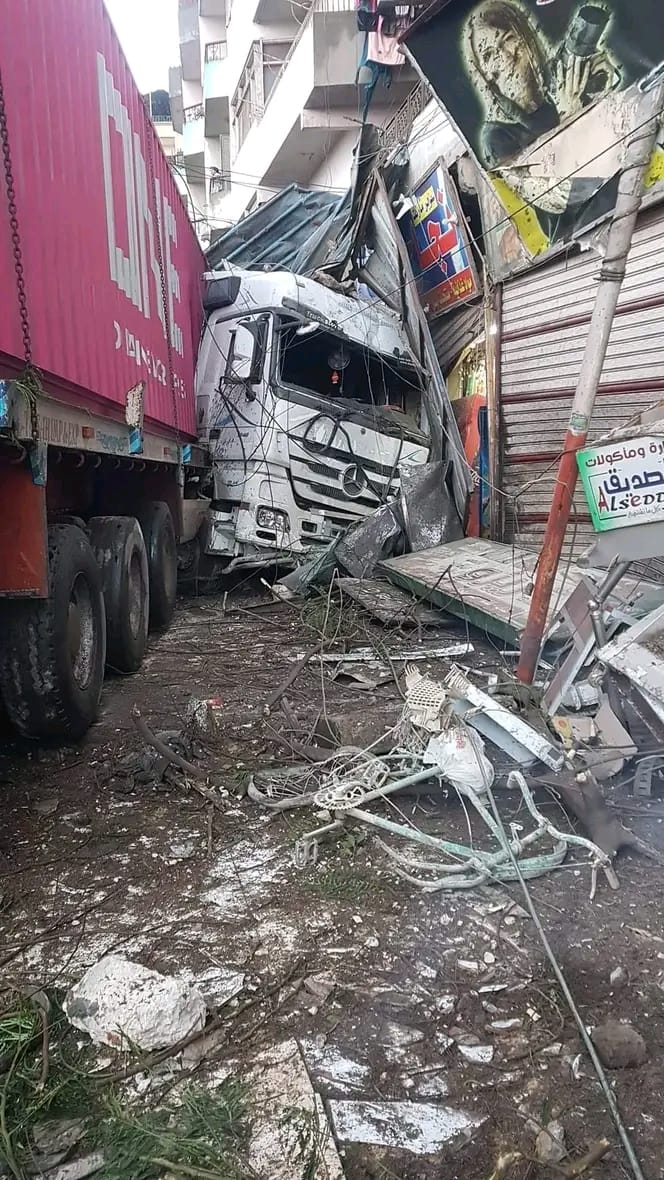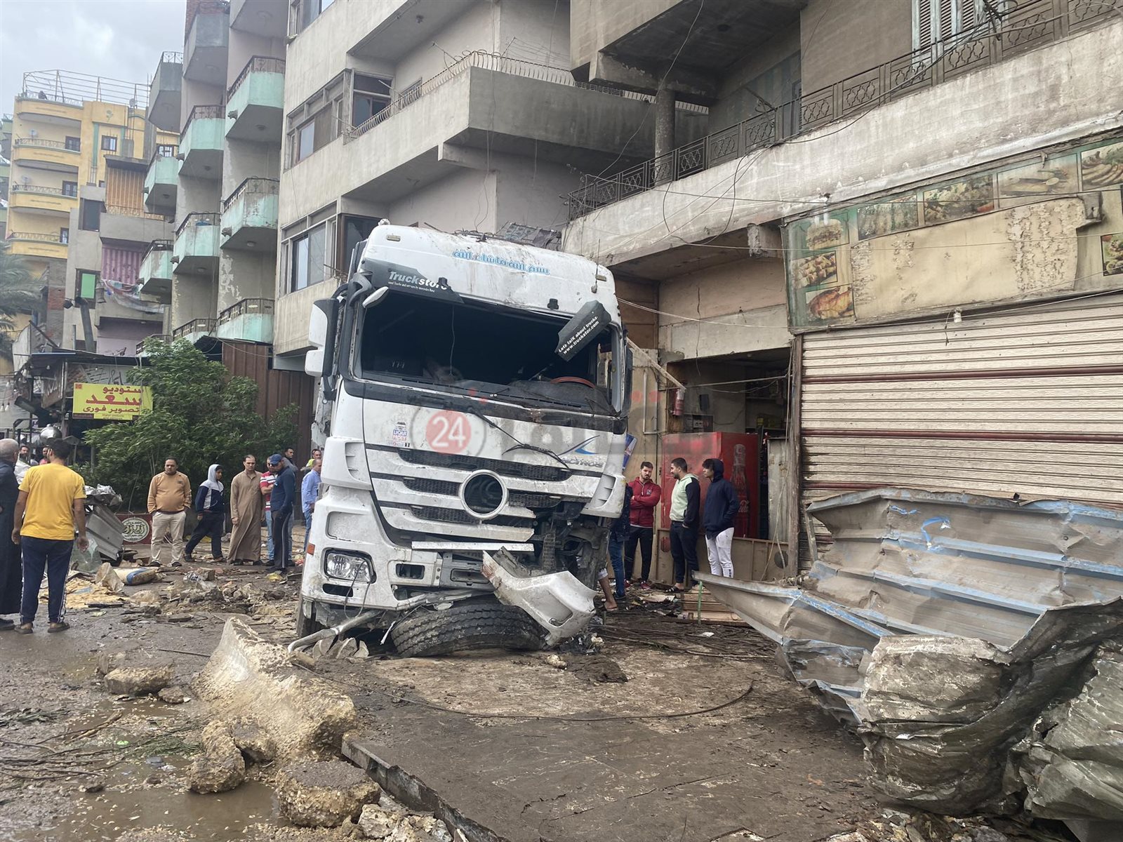 ننشر الصور الأولى لحادث اصطدام سيارة نقل بمحال تجارية في الدقهلية