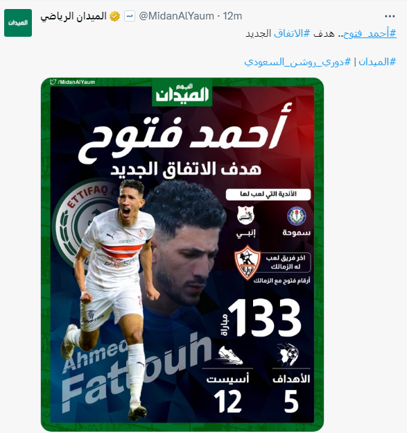 ونشر الحساب الرسمي لـ صحيفة الميدان الرياضي السعودية عبر منصة X، اهتمام نادي الاتفاق السعودي بالحصول على خدمات أحمد فتوح خلال الفترة المقبلة.