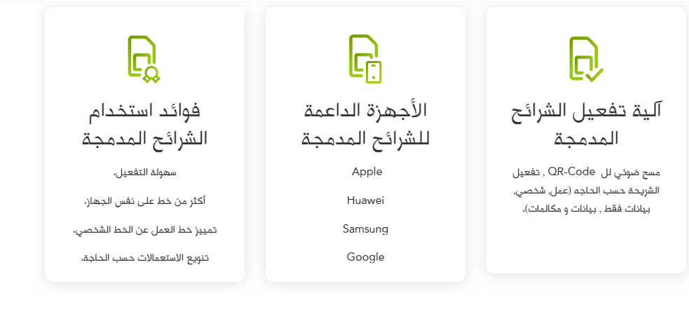 جدير بالذكر أن الأجهزة الداعمة للشرائح المدمجة هي أجهزة آبل وهواوي وسامسونج فضلا عن هواتف جوجل بيكسل، ومن مزايا استخراج شريحة إلكترونية زين، إنها سهلة التفعيل وتمكن المستخدم من استعمال اكثر من خط على نفس الجهاز، كما إنها تمنحه ميزة التميز بين الخط الشخصي وخط العمل وهي ميزة تنويع الاستعمالات حسب الحاجة.