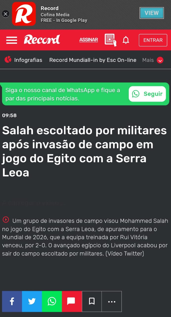 قالت صحيفة ريكورد البرتغالية، إن محمد صلاح مهاجم فريق ليفربول هو نجم منتخب مصر الذي يدربه البرتغالي روي فيتوريا، حيث اقتحمت جماهير مباراة مصر وسيراليون ملعب المباراة من أجل التقاط الصور التذكارية مع اللاعب الدولي المصري.