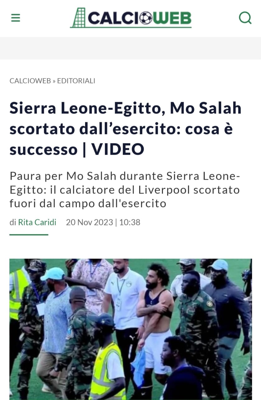 وقالت شبكة كلاسيكو ويب العالمية، إن اللاعب الدولي المصري محمد صلاح المحترف ضمن صفوف فريق ليفربول الإنجليزي قد خرج في حماية الجيش من مبارا ة مصر وسيراليون بعد اقتحام الجماهير ملعب المباراة للوصول له ضمن منافسات تصفيات إفريقيا المؤهلة لبطولة كأس العالم 2026.