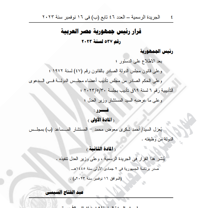 كما نص القرار رقم 537 لسنة 2023، على عزل أحمد شكري معوض محمد، المستشار المساعد (ب) بمجلس الدولة من وظيفته؛ بناء على الحكم الصادر من مجلس الدولة فى الدعوى التأديبية رقم 6 لسنة 69 ق تأديب بجلسة 30-5-2023، وعلى ما عرضه وزير العدل.