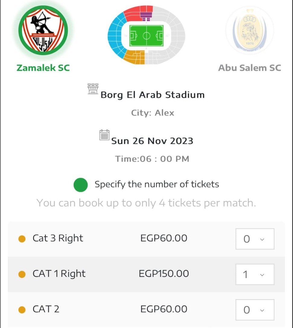 وجاءت أسعار تذاكر مباراة الزمالك وأبو سليم الليبي على النحو الآتي:-