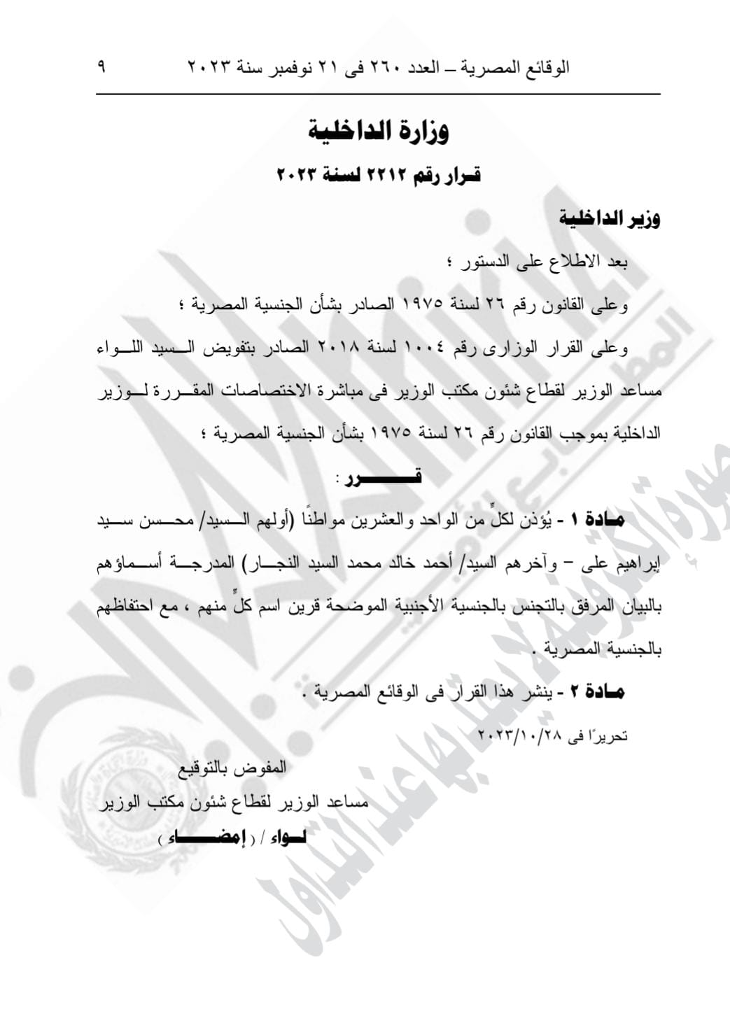 وجاء القرار بعد الاطلاع على الدستور والقانون رقم 26 لسنة 1975 الصادر بشأن الجنسية المصرية، وعلى القرار الوزاري رقم 1004 لسنة 2018 الصادر بتفويض اللواء مساعد الوزير لقطاع شئون مكتب الوزير في مباشرة الاختصاصات المقررة لوزير الداخلية بموجب القانون رقم 26 لسنة 1975 بشأن الجنسية المصرية.