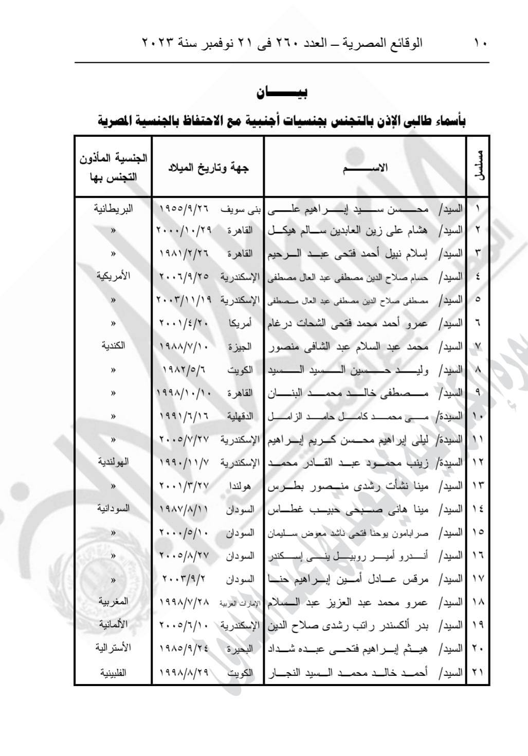 ونص القرار على أن يؤذن لكل من الواحد والعشرين مواطنا أولهم محسن سيد إبراهيم علي، وآخرهم أحمد خالد محمد السيد النجار، المدرجة أسماؤهم بالبيان المرفق بالتجنس بالجنسية الأجنبية الموضحة قرين اسم كل منه، مع احتفاظهم بالجنسية المصرية.