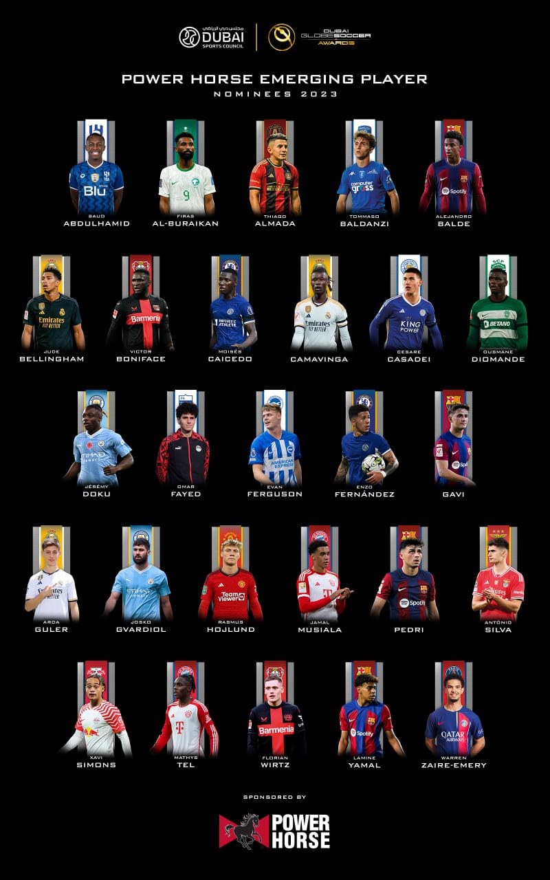 ويوجد في القائمة كل من: السعودي سعود عبد الحميد وصالح الشهري، وبالدي ولامين وبدري وجافي نجوم فريق برشلونة الإسباني، وجولر وبيلينجهام لاعبي فريق ريال مدريد الإسباني بالإضافة إلى البلجيكي دوكو لاعب فريق مانشستر سيتي الإنجليزي وإيميري لاعب فريق باريس سان جيرمان الفرنسي كما يوجد الألماني جمال موسيالا لاعب فريق بايرن ميونيخ الألماني وهويلند مهاجم فريق مانشستر سيتي الإنجليزي.