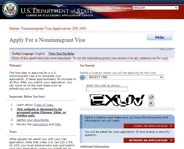 استخراج فيزا أمريكا تتطلب ملء نموذج DS-160 عبر الإنترنت، ومن ثم طباعته، حيث يتم من خلاله تحديد نوع التأشيرة، وتحديد موعد المقابل في السفارة الأمريكية، وينبغي أن تكون الإجابة على جميع الأسئلة الموجودة في النموذج باللغة الإنجليزية فقط.