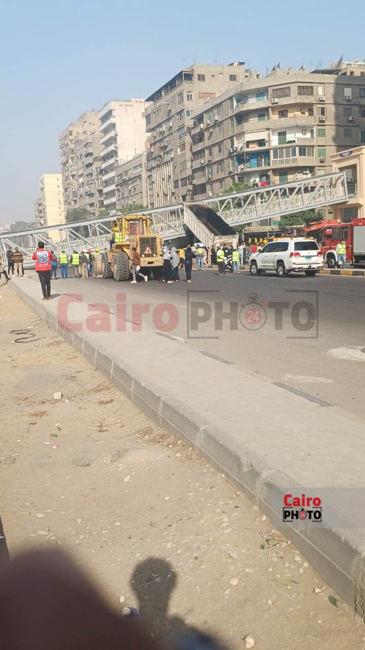 و استعانت الحماية المدنية بعدد من الأوناش، لإعادة الجزء المنهار من كوبري المشاة في شارع
