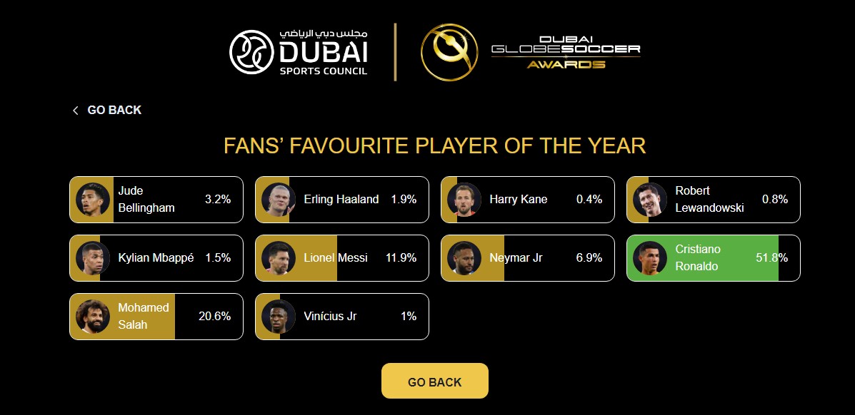 وحصل رنالدو حتى الآن، على نسبة 51.8% من الأصوات، فيما حصل محمد صلاح على 20.6%، وجاء ليونيل ميسي نجم إنتر ميامي في المركز الثالث بـ 11.9%، والبرازيلي نيمار في المرتبة الرابعة بـ 6.9%.