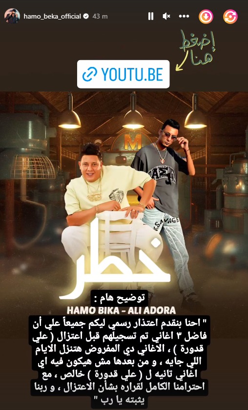 اعتذر مؤدي المهرجانات حمو بيكا لكل جمهوره ومتابعيه بسبب اعتزامه طرح أغانٍ جديدة خلال الأيام المقبلة، يتعاون فيها مع مؤدي المهرجانات المعتزل علي قدورة، مؤكدًا أنه يحترم قرار الأخير، وأن هذه الأغاني الأخيرة له مع المغني المعتزل.