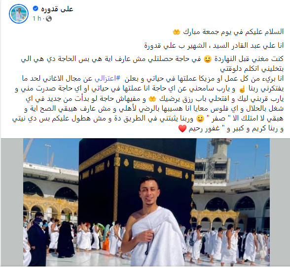 وتابع: أنا بريء من كل عمل أو مزيكا عملتها في حياتي وبعلن اعتزالي مجال الأغاني لحد ما يفتكرني ربنا، ويارب سامحني عن أي حاجة أنا عملتها في حياتي أو أي حاجة صدرت مني.